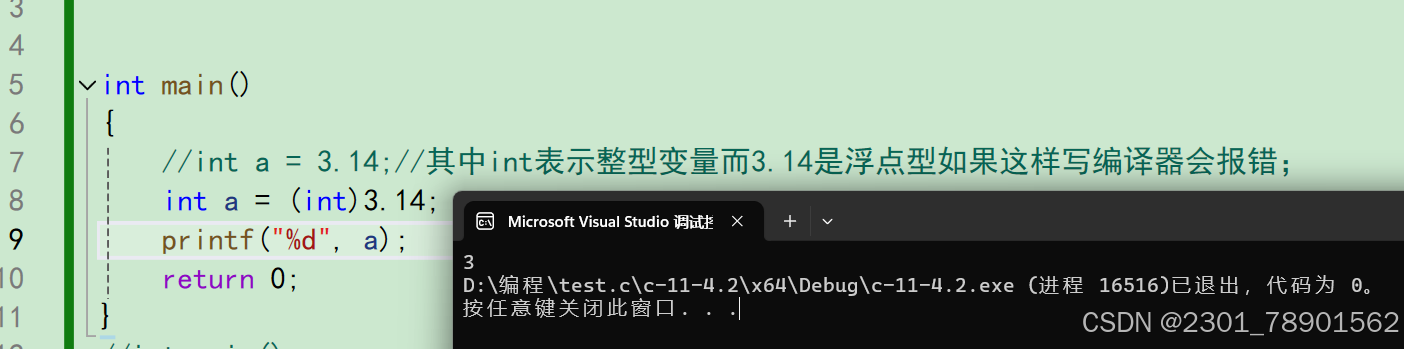 注意将3.14强制转换为整型编译器会自动省去小数点后的1数。