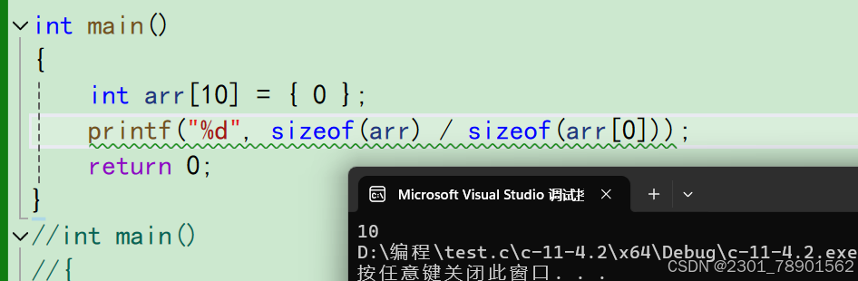 1 int arr[ 10 ]; // 创建数组 2 arr[ 9 ] = 10 ; // 实⽤下标引⽤操作符。 3 [ ] 的两个操作数是 arr 和 9 。