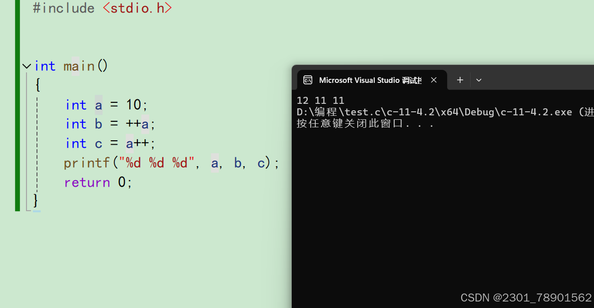 二者 分为前置++和后置++;前置--和后置--,使用规则是 前置++先+1后使用,后置++先使用后+1,前置--和后置--与前置++和后置++使用规则一样。