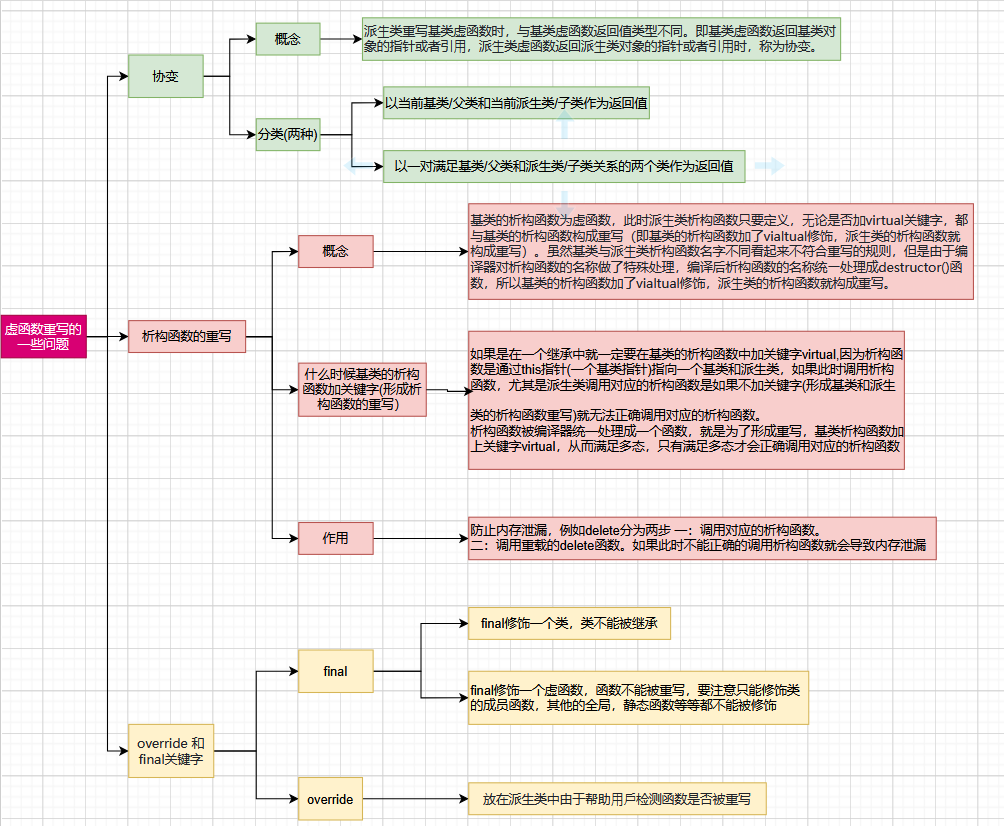 }基类的析构函数为虚函数,此时派⽣类析构函数只要定义,⽆论是否加virtual关键字,都与基类的析 构函数构成重写(即 基类的析构函数加了 vialtual修饰,派⽣类的析构函数就构成重写)。 虽然基类与派⽣类析构函数名字不同看起来不符合重写的规则,但是 由于编译器对析构函数的名称做了特殊处理,编译后析构函数的名称统⼀处理成destructor()函数, 所以基类的析构函数加了 vialtual修饰,基类和派⽣类的析构函数就构成重写。