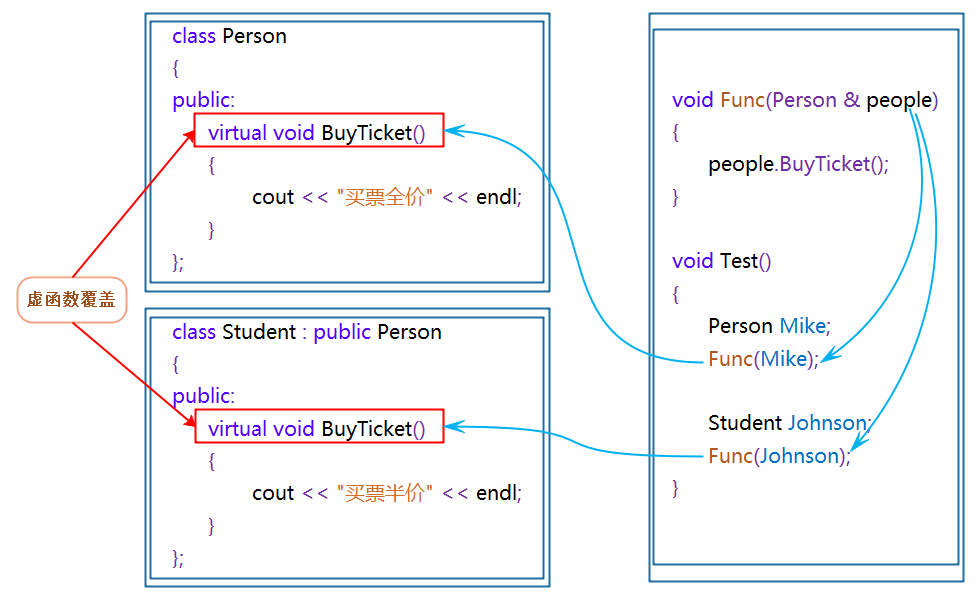 //2.2被调⽤的函数必须是虚函数,并且完成了虚函数重写/覆盖。
