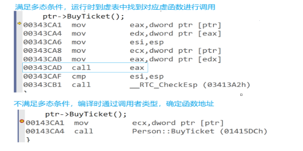 由于多态的调用都是基类的指针或者引用,那也就意味着其实看到的都是一个基类/父类对象(切片)。所以在完成了虚函数的重写了以后,不同类型基类/父类和派生类/子类当中虚表(虚函数表)当中放的就是不同的虚函数(基类/父类是基类/父类的,重写是重写后的),但是不是直接调用,而是运行时到指向对象的虚函数表中找到对应的虚函数进行调用(我们之前函数重载都是在编译时通过参数匹配就已经确定了)而运行时动态是运行时让你到指向对象的虚表中去找,这时候不就指向谁调用谁【总结指向谁调用谁:执行逻辑都是运行时到虚表中找对应的虚函数进行调用。即不管传基类函数派生类都是一致性的动作(通过虚表指针->虚表->取到虚函数地址->call函数地址)到同一个虚表中call(取地址),那为什么结果不同(因为传的对象不同,指向的虚表内容不同)。