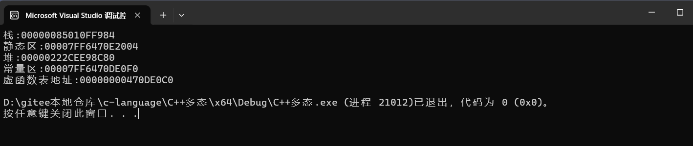 从运行结果来看,在vs下虚函数是储存在常量区,而网上一般都是说储存在静态区,其他编译器也可能不同,感兴趣的私下可以去验证!!!