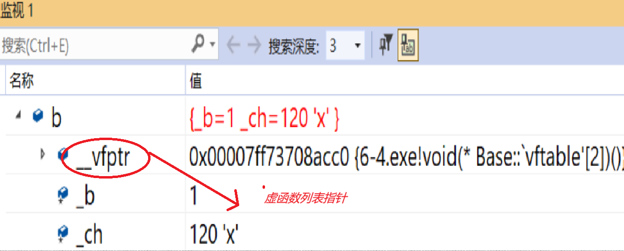 }分析:根据我们前面讲的内存对齐规则可以知道如果只有变量_b和_ch则类的大小是8个字节,但是运行结果是12字节,由于类中有一个虚函数,所以会有一个虚函数列表(一个指针数组)由于储存虚函数的地址。
