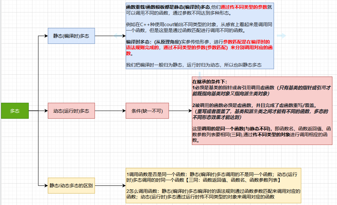多态分为编译时多态(静态多态)和运⾏时多态(动态多态),由于编译时多态(静态多态)我们前面的函数重载、函数模板就是,所以这⾥我们重点讲运⾏时多态。