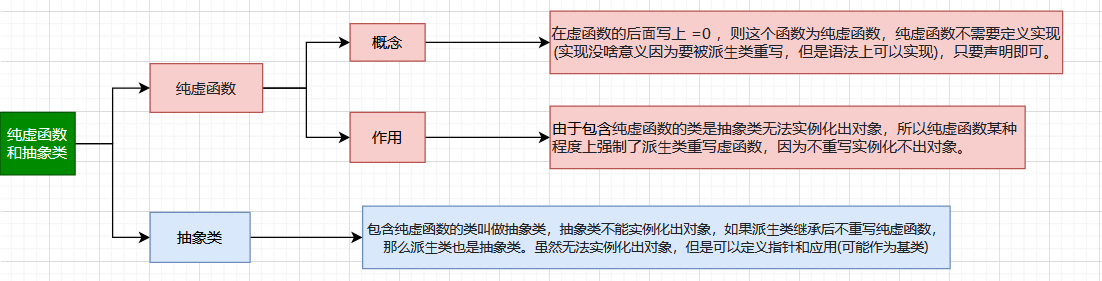 在 虚函数的后⾯写上 =0 ,则这个函数为纯虚函数 ,纯虚函数 不需要定义实现 (实现没啥意义因为要被派⽣类重写,但是语法上可以实现), 只要声明即可 。