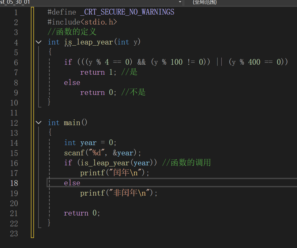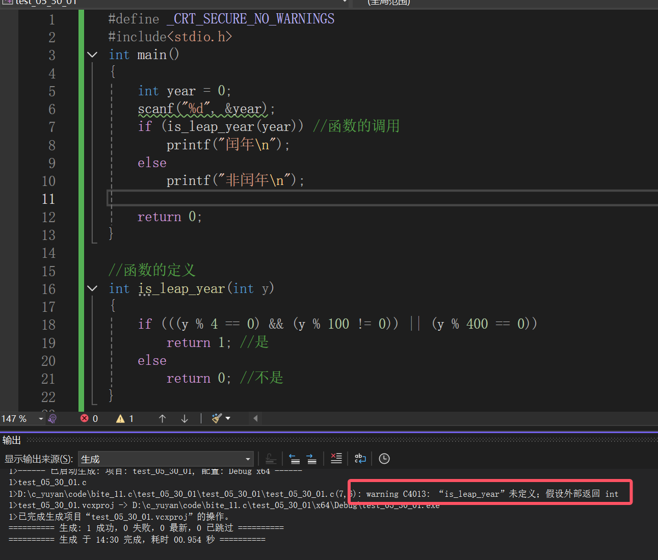 如:int is_leap_year(int y); 函数声明中参数只保留类型,省略名字也是可以的(即y),因为声明中的y不会用到,定义里才用得到。 代码变成这样就可以正常编译了