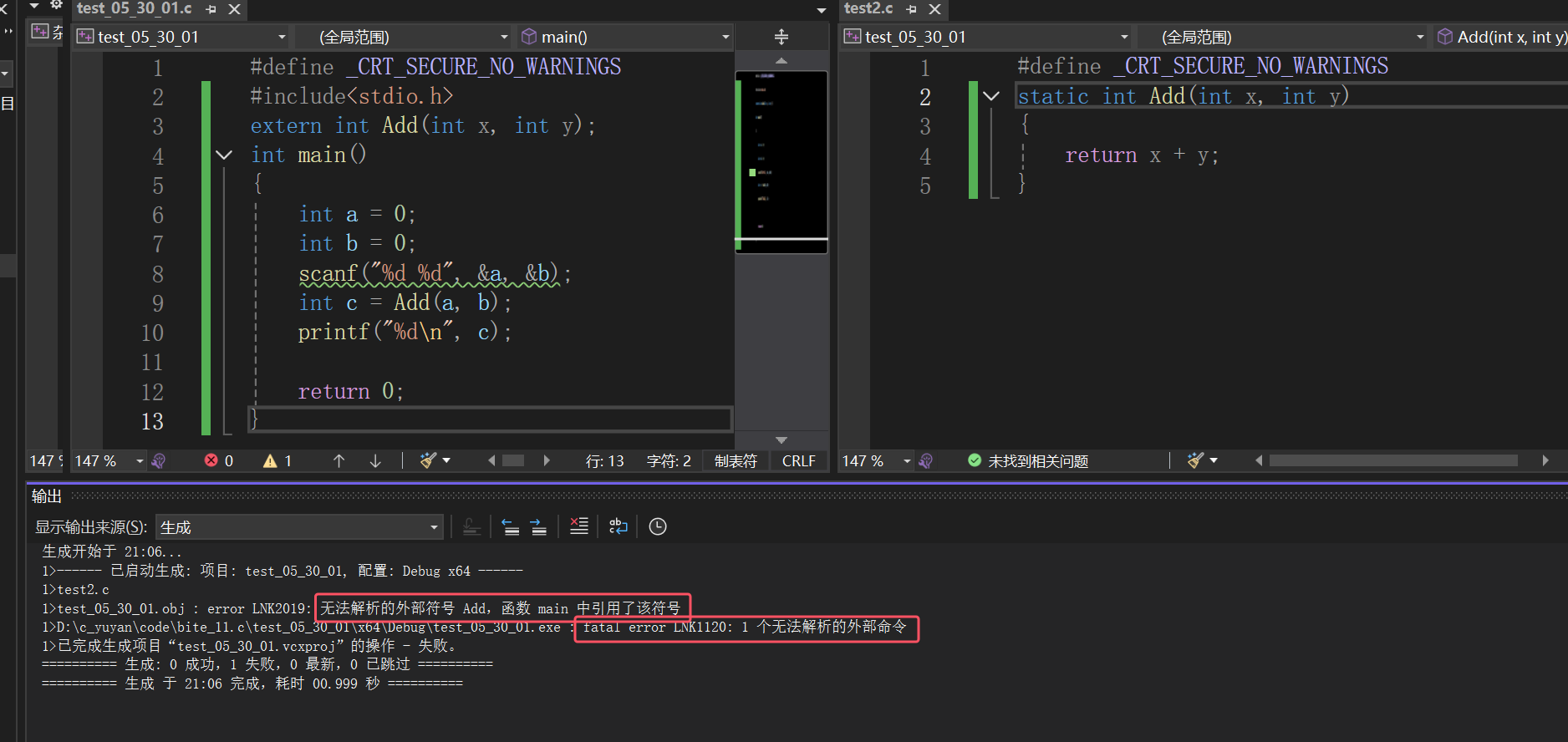 但是会报警告,因为没有声明。这里还有另一种解决办法。 因为函数来自外部文件,在(test_05_30_01.c)中声明需要在前面加一个extern,extern是用来声明外部符号的。