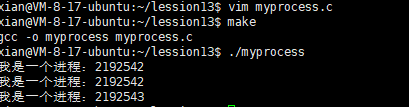 有两个进程pid,说明确实创建了一个子进程。进程=PCB+代码和数据。在fork之后,OS会给子进程分配PCB,子进程会继承拷贝父进程的代码和部分数据继续执行接下来的代码,下面的代码被父进程执行一次后又被子进程执行。