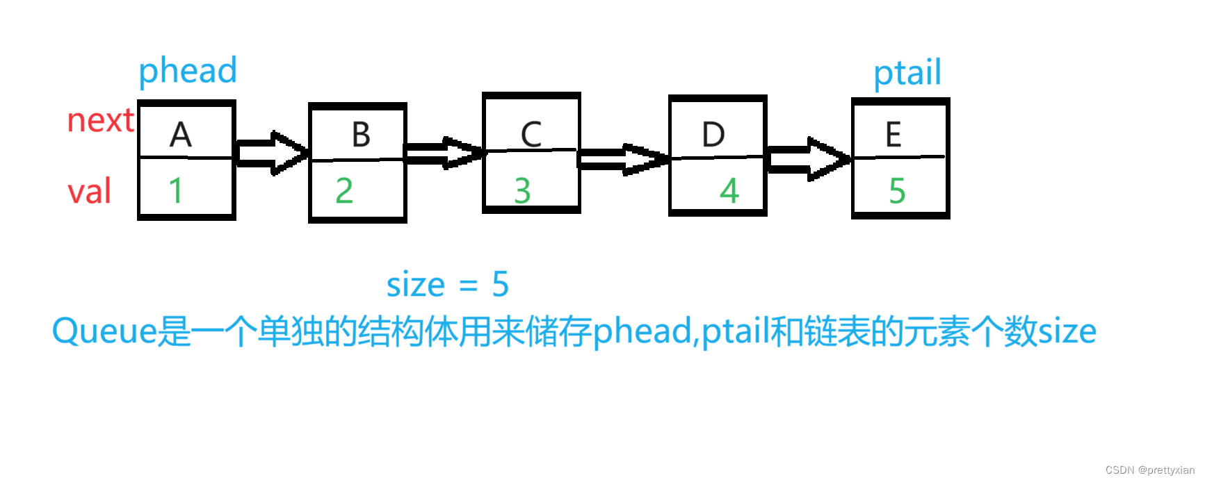 bool QueueEmpty(Queue* pq);这里的关键在于重新设置一个结构体Queue用来操作phead和ptaill,如果没有这个结构体,需要传入二级指针来实现,会更加复杂。同时Queue中的size还可以记录数据的个数;如果没有size需要计数器遍历链表才能得到链表的长度。