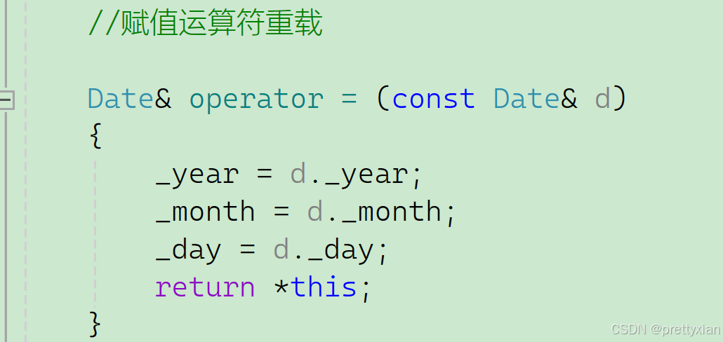 1. 赋值运算符重载是⼀个运算符重载,规定必须重载为成员函数。赋值运算重载的参数建议写成 const 当前类类型引用,否则会传值传参会有拷贝。