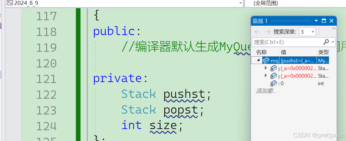 //编译器默认生成MyQueue的构造函数调用了Stack的构造,完成了两个成员的初始化