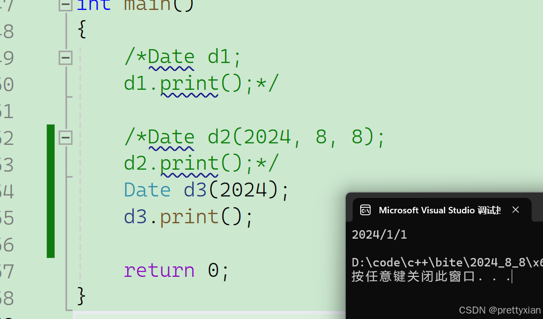 }需要注意,全缺省构造函数和无参构造函数虽然构成函数重载,但是在不传入参数时会产生调用歧义,所以不能同时存在。全缺省和带参的构造函数只是默认参数的差别,不构成函数重载。