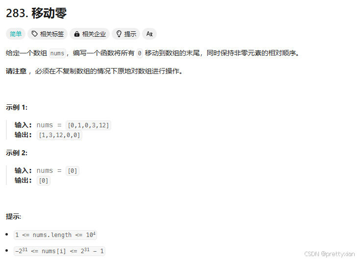设A为dest,设B为cur。进入操作之前,初始状态A左边为非零区,右边为零区,所以初始化A为-1。注意:处理过程中cur左边为未处理区右边为零区,初始时不可以是这个状态。是cur要从0开始遍历才能满足处理过程中,cur左边为未处理区右边为零区。所以我们初始化cur的为0。cur从零开始遍历,遇到非零的元素就移到dest左边(实际操作为移到dest的位置,dest再++)。操作一共要执行nums.size()次。
