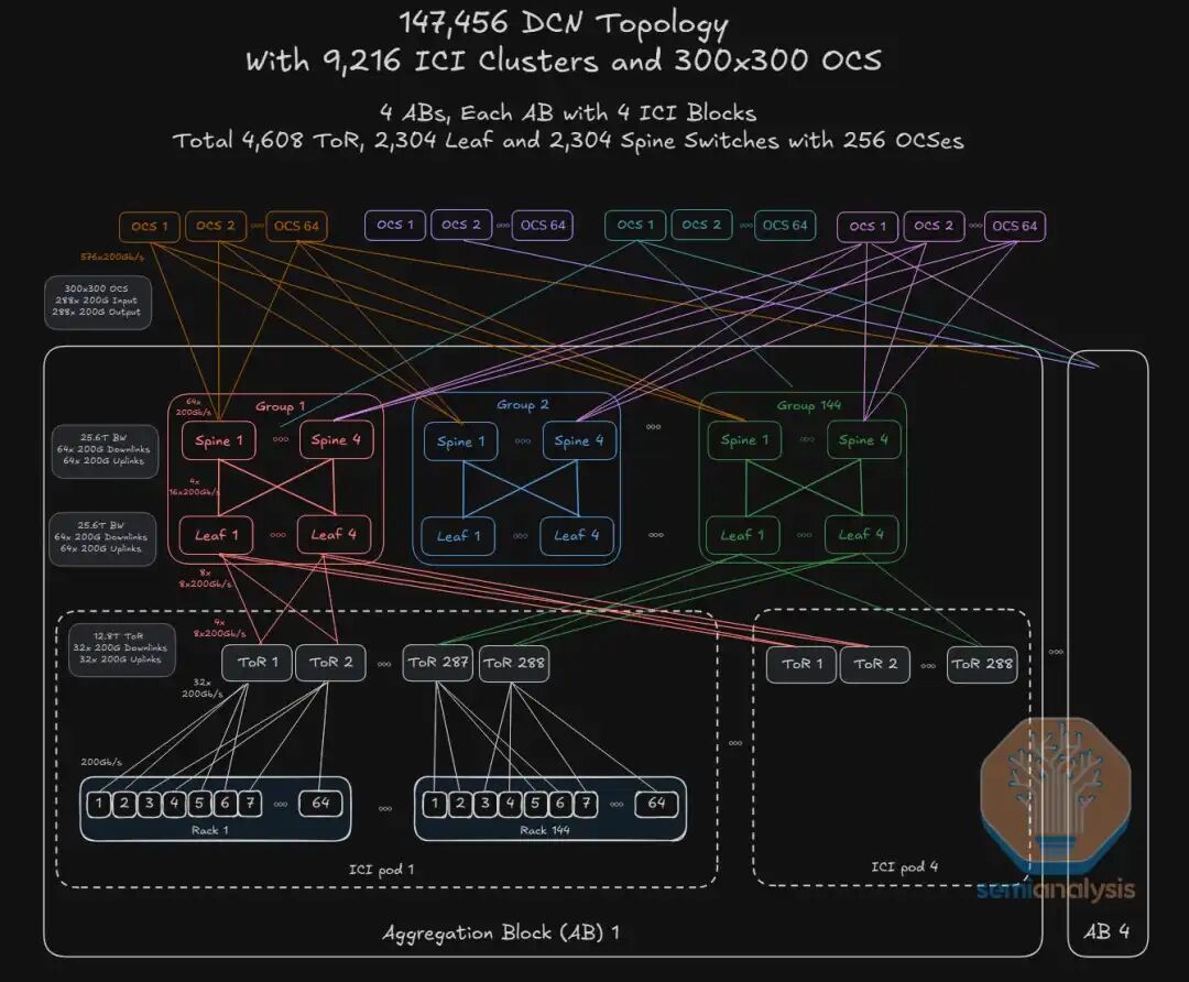 承接上文,接下来我们深度分享一下如图2所示Google如何用 一套物理与逻辑高度解耦、硬件与软件深度协同的 Jupiter DCN(数据中心网络) 支撑 147,456 颗 TPU v7 的 超大规模 AI 集群 。 这套基于 Ethernet/Falcon 协议的Jupiter DCN前端网络与 TPU 内部基于 3D Torus/G-ICI 协议(9.6T/chip)的 ICI 后端专网实现了彻底的物理隔离 , Jupiter DCN全网部署了 73,728 块 400G DCN IPU 网卡 ,4,608 台 12.8T ToR (TH3)、2,304 台 25.6T Leaf (TH4) 和 2,304 台 25.6T Spine (TH4) 交换机 , 接下来我们一起剥洋葱式解构庞大的物理网络集群背后分层设计的奥秘。