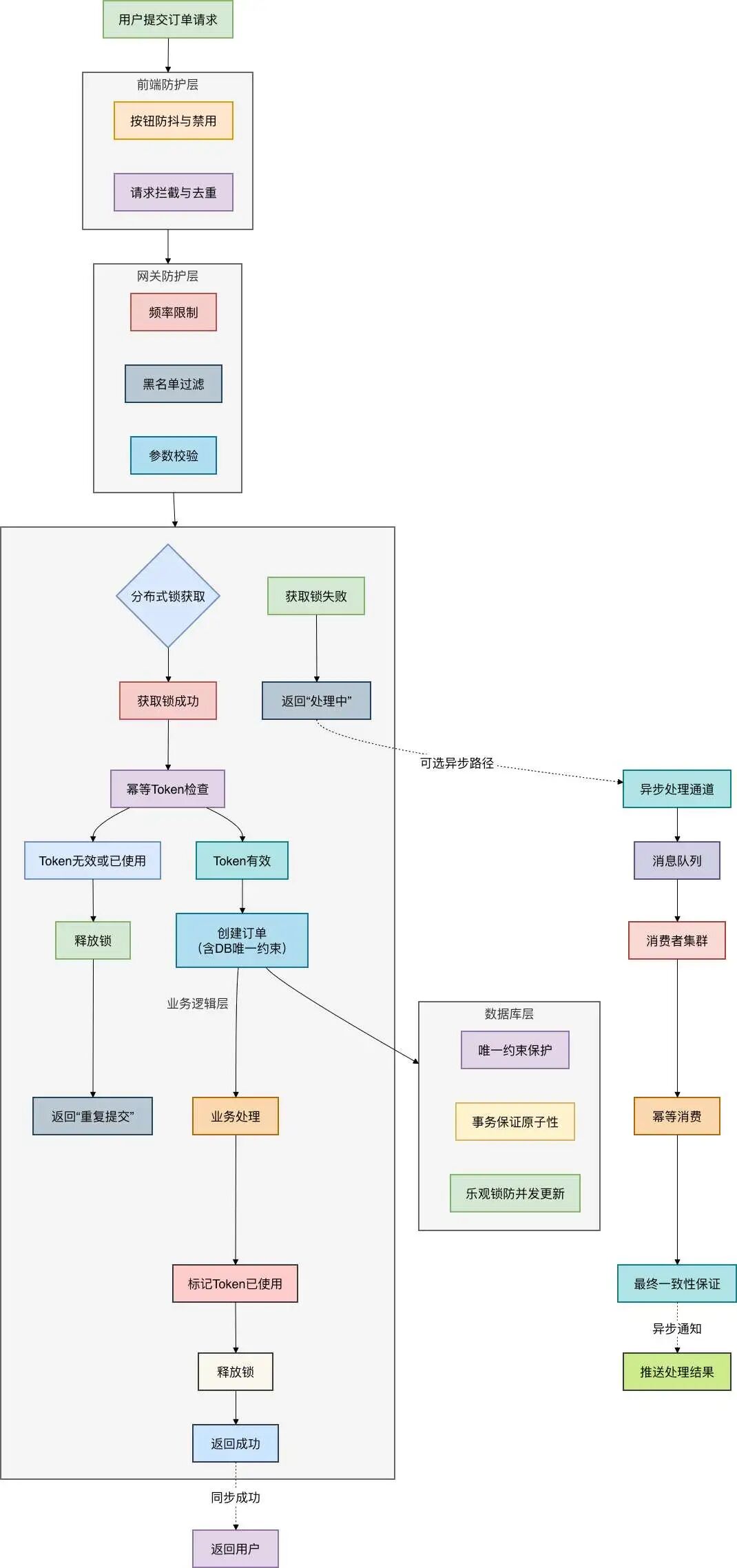 从图中可以看到,从用户点击到订单落库,几乎每个环节都可能成为重复提交的“案发现场”。