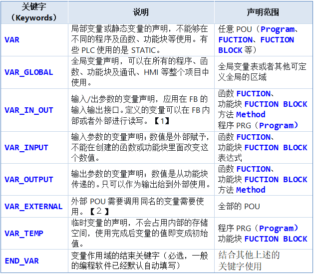 关于PLC中的临时变量和静态变量的声明,我们需要了解到PLC的变量作用域,一般来说,声明的变量必须在相对应的作用域: