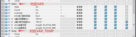 而在西门子博途中,静态变量和临时变量的关键字和ST标准里面有些差异: