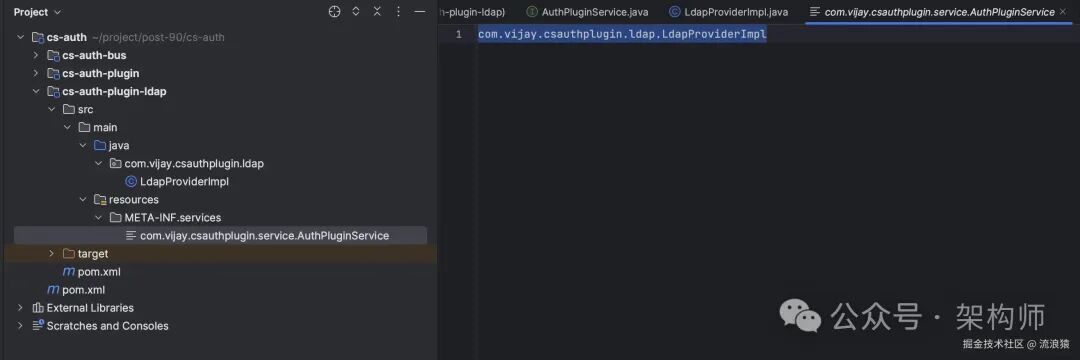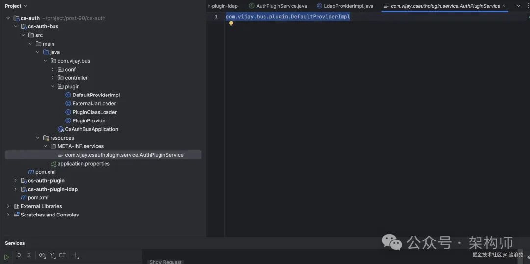 2.resources目录下创建META-INF/services目录并在目录下创建一个名为SPI接口类全路径限定名的文件com.vijay.csauthplugin.service.AuthPluginService,文件内容为DefaultProviderImpl全路径限定名com.vijay.bus.plugin.DefaultProviderImpl
