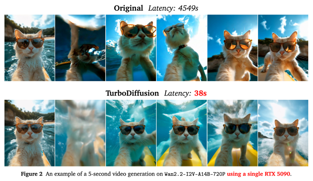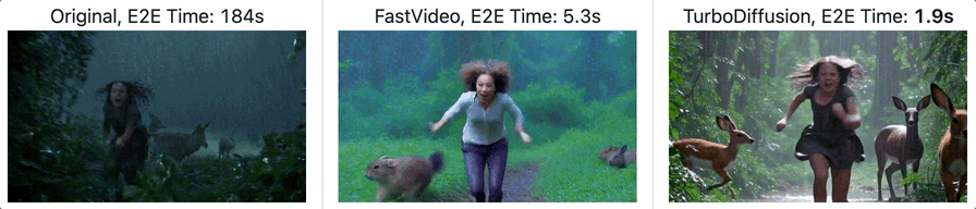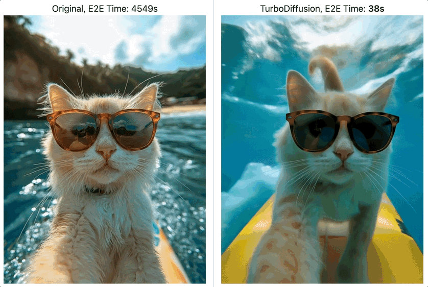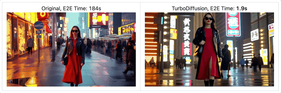 得益于以上四项核心技术的协同作用,TurboDiffusion 的视频生成加速效果被提升到了前所未有的水平。加之训练阶段的并行训练策略,进一步平衡了推理效率和生成质量。