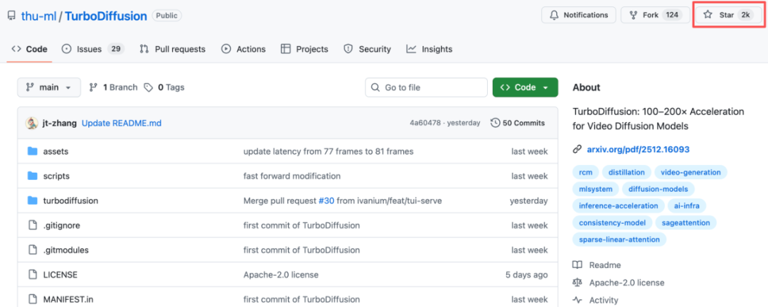 目前,TurboDiffusion 在 GitHub 上已经收获 2k Star,社区关注度持续提升。