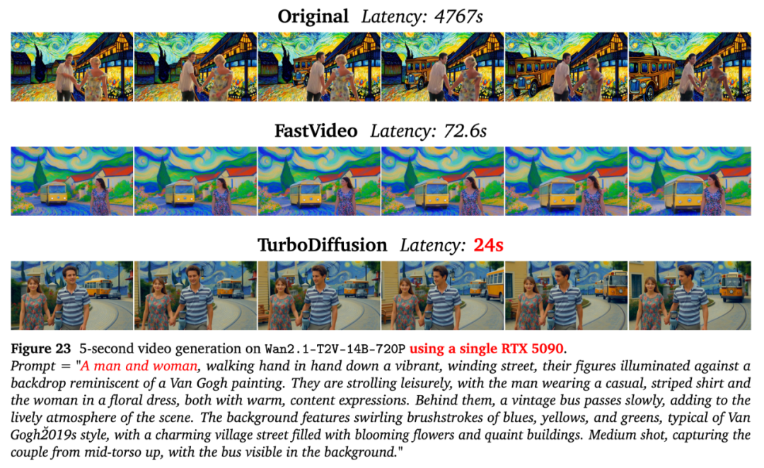 我们以 14B 大小的模型生成 5 秒 720p 的视频为例,TurboDiffusion 可以在单张 RTX 5090 上实现几乎无损的端到端 119 倍加速。