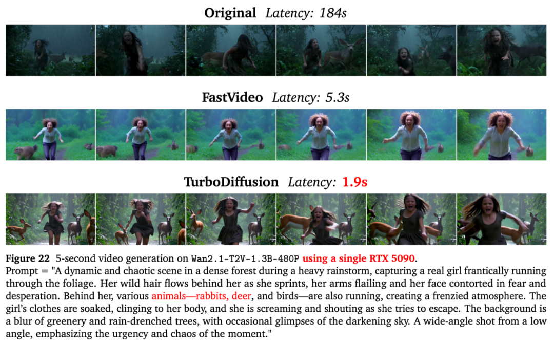 我们先以 1.3B 大小的模型生成 5 秒 480p 的视频为例,在单张消费级显卡 RTX 5090 上,使用官方实现需要 184 秒才能生成。引入 TurboDiffusion 之后,则只要 1.9 秒就能搞定。