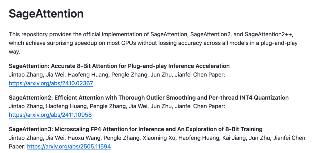 其中使用 SageAttention 进行低比特量化注意力加速。它是一系列通过量化实现高效注意力机制的工作,自 2024 年 10 月以来陆续推出了 V1、V2 和 V3,能够在无损准确率的情况下,在大多数 GPU 上实现即插即用的加速效果。