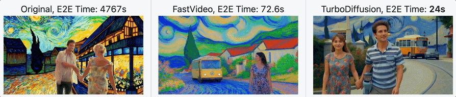 基线模型与引入已有加速方案(FastVideo)、TurboDiffusion 后的生成时长与效果对比。