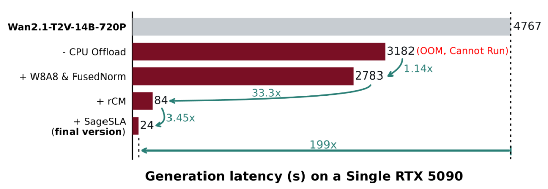 多项推理加速技术加持下,视频生成时长从 4767 秒降至 24 秒,提速近 200 倍。