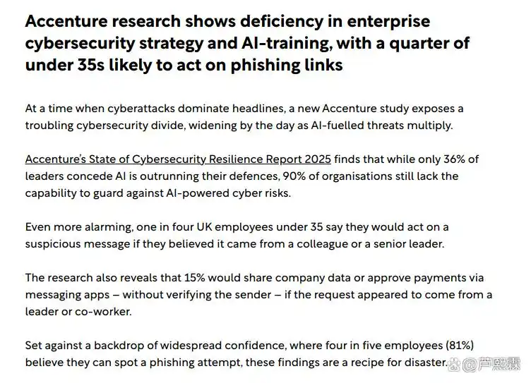 埃森哲于2025年发布的《网络安全弹性报告》揭示了一项反直觉发现:在英国职场中,35岁以下员工群体(主要涵盖Z世代与部分千禧一代)对钓鱼攻击的易感性显著高于年长员工。具体而言,25%的受访者承认“若可疑消息看似来自可信来源(如同事或领导),会采取行动(如点击链接、下载附件或执行转账)”;另有15%表示可能在未验证身份的情况下通过即时通讯工具共享敏感数据或批准付款。值得注意的是,81%的员工自认为具备识别钓鱼尝试的能力,但仅有20%接受过相关培训。这种“高自信—低能力”的错配状态,构成了典型的安全认知陷阱。