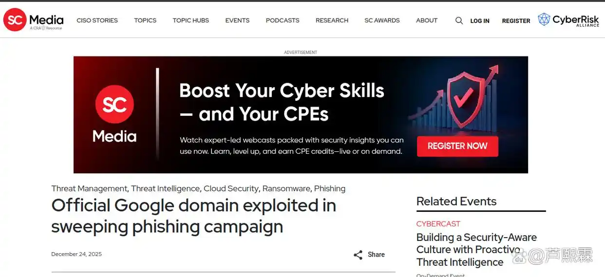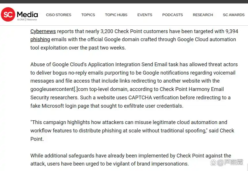 电子邮件作为企业通信的核心渠道,长期是网络攻击的主要入口。尽管SPF(Sender Policy Framework)、DKIM(DomainKeys Identified Mail)与DMARC(Domain-based Message Authentication, Reporting & Conformance)等协议显著提升了邮件来源的真实性验证能力,但攻击者不断演化其战术,转而利用合法云服务平台作为攻击跳板。2025年末,Check Point Harmony Email Security团队披露了一起针对全球超3000家组织的大规模钓鱼活动,其特殊之处在于完全依托Google Cloud官方基础设施完成攻击链构建,包括邮件发送、初始链接托管及部分重定向环节。
