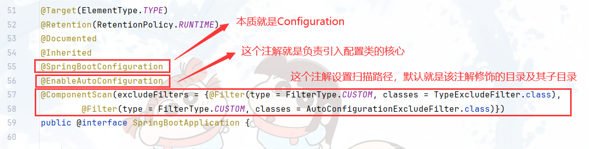 @Target:描述注解的使用范围(即被修饰的注解可以用在什么地方)@Retention:描述注解保留的时间范围@Documented:描述在使用javadoc工具为类生成帮助文档时是否要保留其注解信息@Inherited:使被它修饰的注解具有继承性(如果某个类使用了被 @Inherited 修饰的注解,则其子类将自动具有该注解)@EnableAutoConfiguration 详解@Target({ElementType.TYPE})