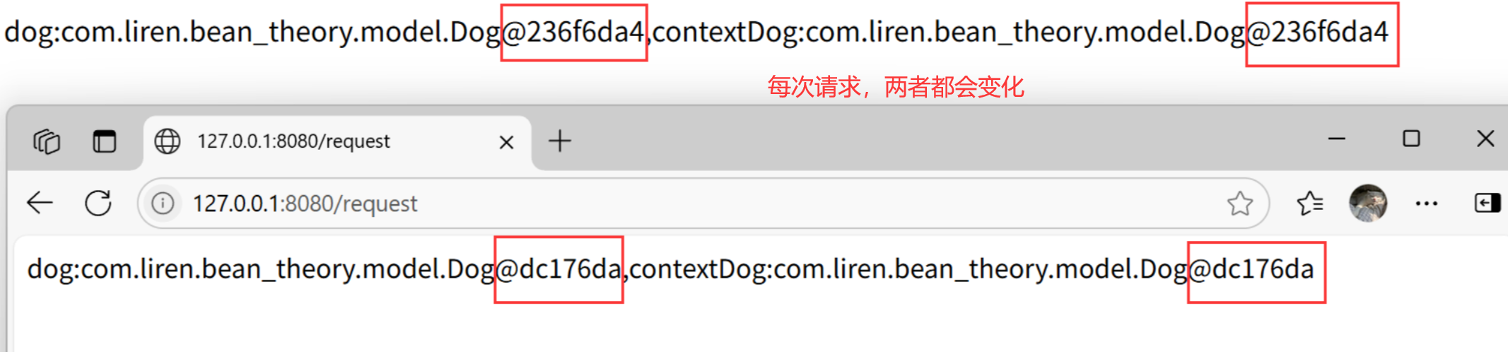 观察 ContextDog,每次获取的对象都不一样(而注入的对象 dog 在 Spring 容器启动时,就已经注入了,所以多次请求也不会发生变化)