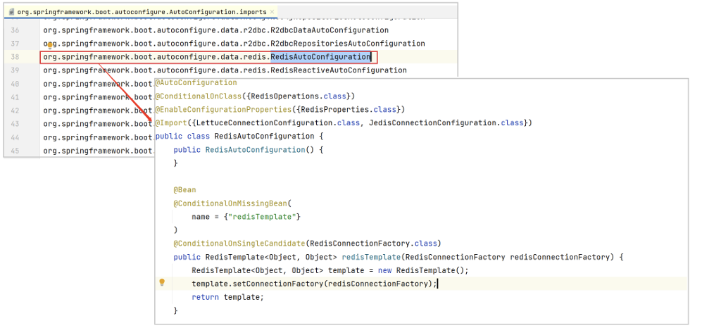 @Conditional 等注解的判断进行动态加载。@Conditional 是 spring 底层注解,意思就是根据不同的条件,来进行自己不同的条件判断,如果满足指定的条件,那么配置类里边的配置才会生效。META-INF/spring.factories 文件是 Spring 内部提供的一个约定俗成的加载方式,只需要在模块的 META-INF/spring.factories 文件中配置即可,Spring就会把相应的实现类注入到容器中。比如 Redis 的配置:RedisAutoConfiguration