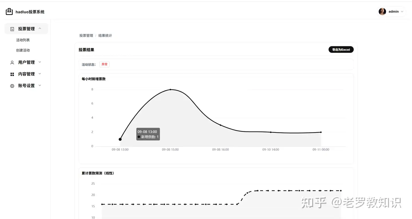 3. 投票结果统计: 折线图统计每个小时新增的投票数, 条形图统计每个投票选手得票数。