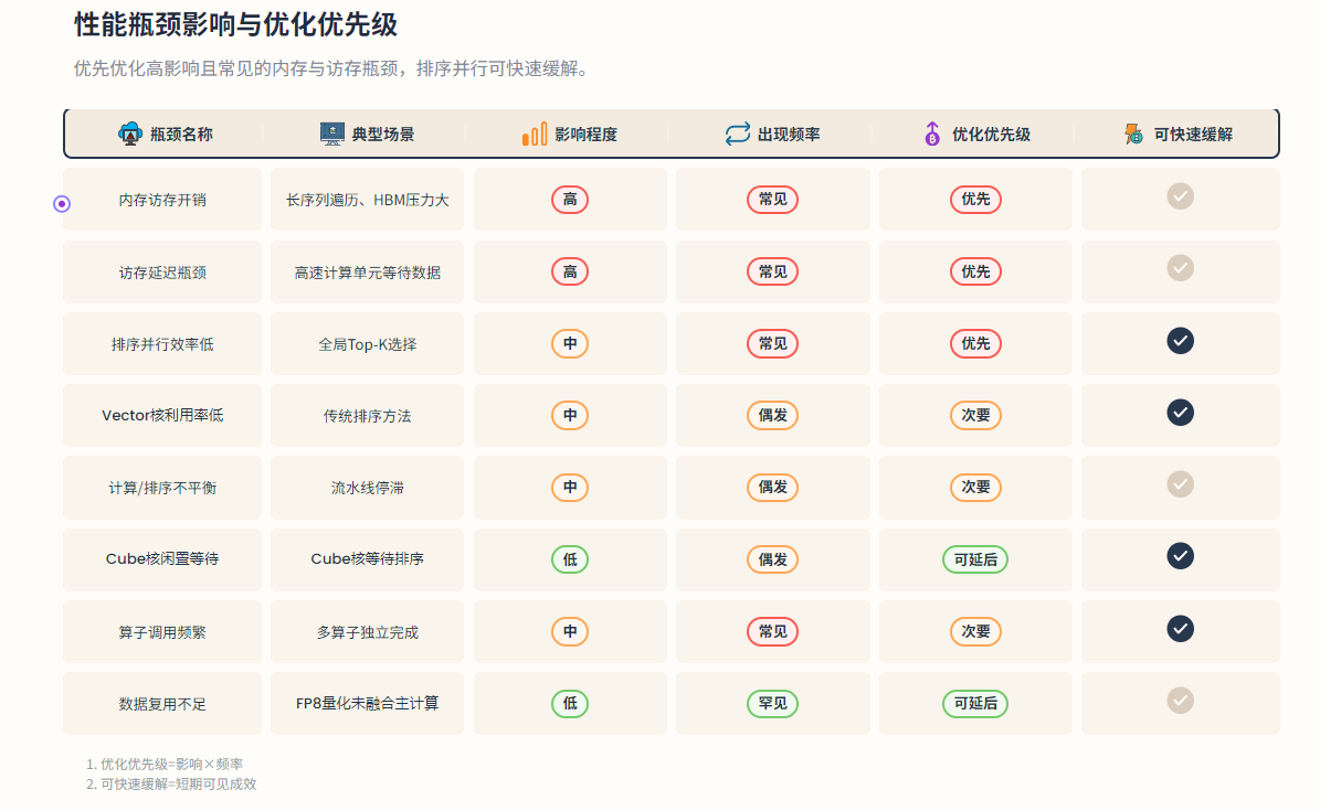 排序阶段并行效率低 | 全局 Top-K 排序复杂度 O (L log L),Vector 核未充分利用 | 排序耗时远超计算,拖累整体吞吐 |