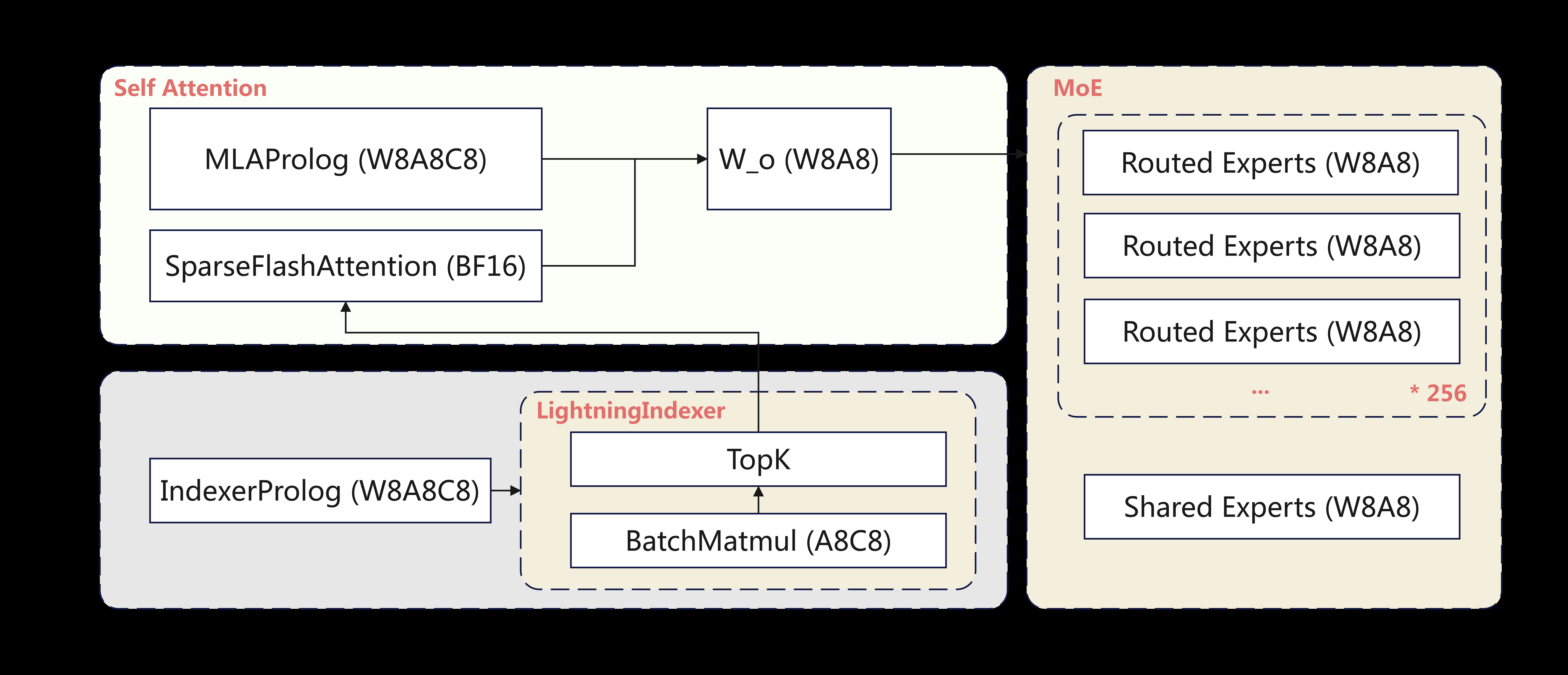 同样地,Lightning Indexer 本身被实现为一个从输入到输出 Top-K 全流程融合的算子,取代了可能的“GEMM算子 + 激活算子 + TopK算子”链条,实现一次内核启动完成所有工作。这不仅节省了调度开销,也充分利用了片上数据,避免了反复写回和读出的延迟。