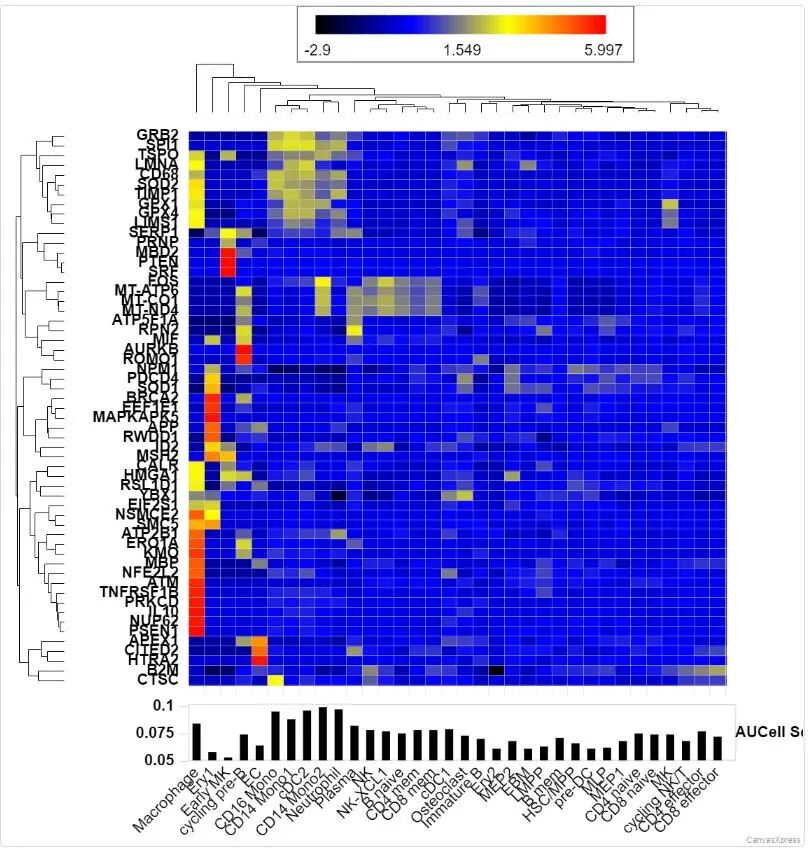 步骤9:分析感兴趣基因集如衰老基因集在SLE患者不同细胞亚群中的相对表达情况。如图所示,在3所处位置选择Celltypes