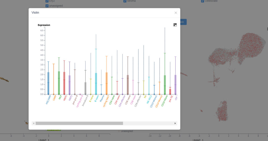 步骤2:在分析界面有各种参数,主要看Results界面:UMAP模块中,可以对不同细胞类型进行基因表达分析。