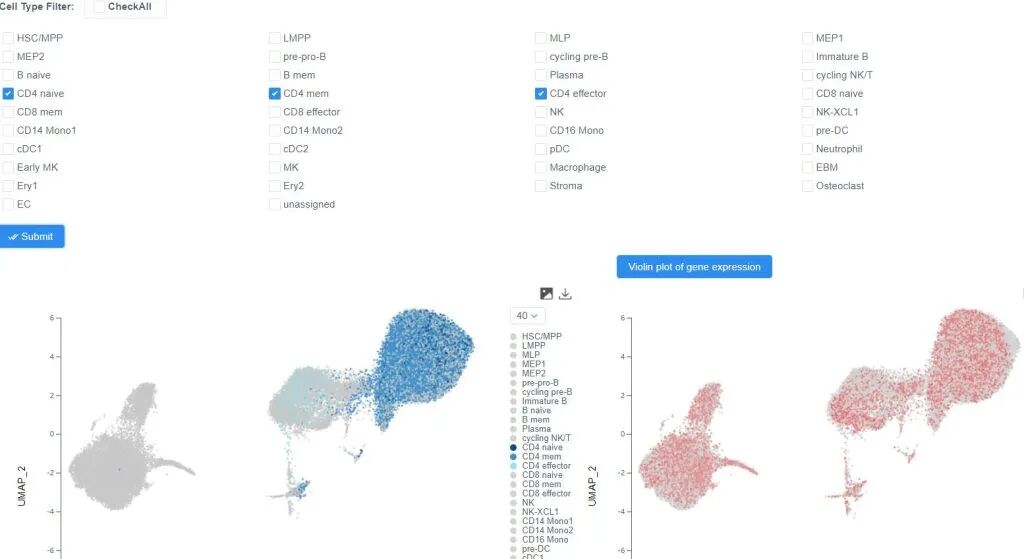 UMAP可视化模块:支持多级细胞注释(原始注释与统一注释切换)和基因表达可视化(如小提琴图),可用于探索细胞异质性或恶性细胞特征。 表达分析模块:允许用户查询特定基因签名或血液疾病相关基因集(如“AML LSC+基因”)的表达水平,并进行样本间比较。 交互式筛选工具:用户可根据物种、组织来源、疾病状态等条件自定义筛选数据子集,并支持跨数据集的对比分析。