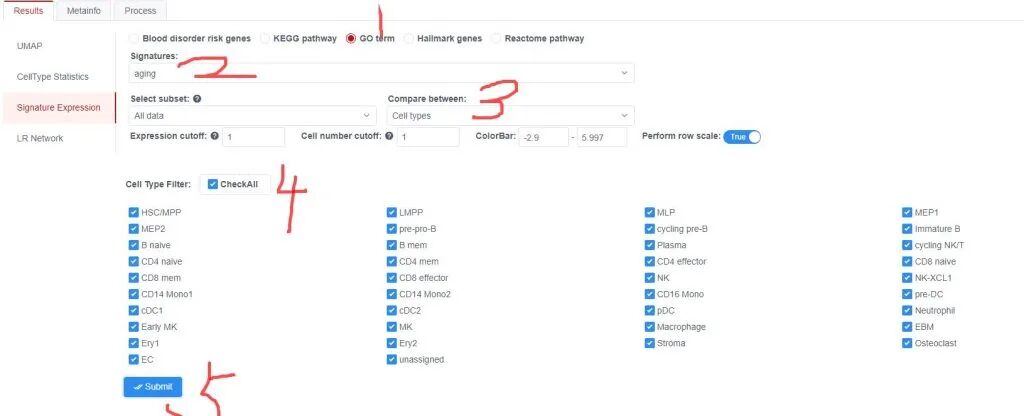 步骤7:功能基因集在SLE 患者细胞亚群中的表达情况。在Signature Expression模块,我们首先在上方Filter过滤模块所有样本,点击submit。不选择就默认全部样本。然后在不同基因功能数据集来源中,选择Reactome pathway,选择感兴趣的通路。先在7所处位置选择比较类型是样本间比较,然后选择目的cell type.点击提交。