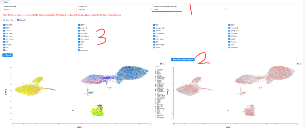 步骤3.在Expression of selected gene 中输入目标基因IFI44L,可以在2所在下面查看SLE患者中IFI44L在不同细胞亚群中的表达情况。然后可以在3处只选择CD4+T细胞查看