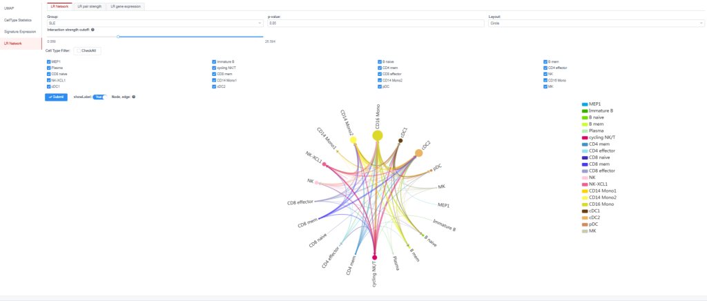 “LR网络”模块展示了选定细胞类型的预测配体-受体网络。该模块包含三个级别的LR分析:LR网络、LR配对强度和LR基因表达