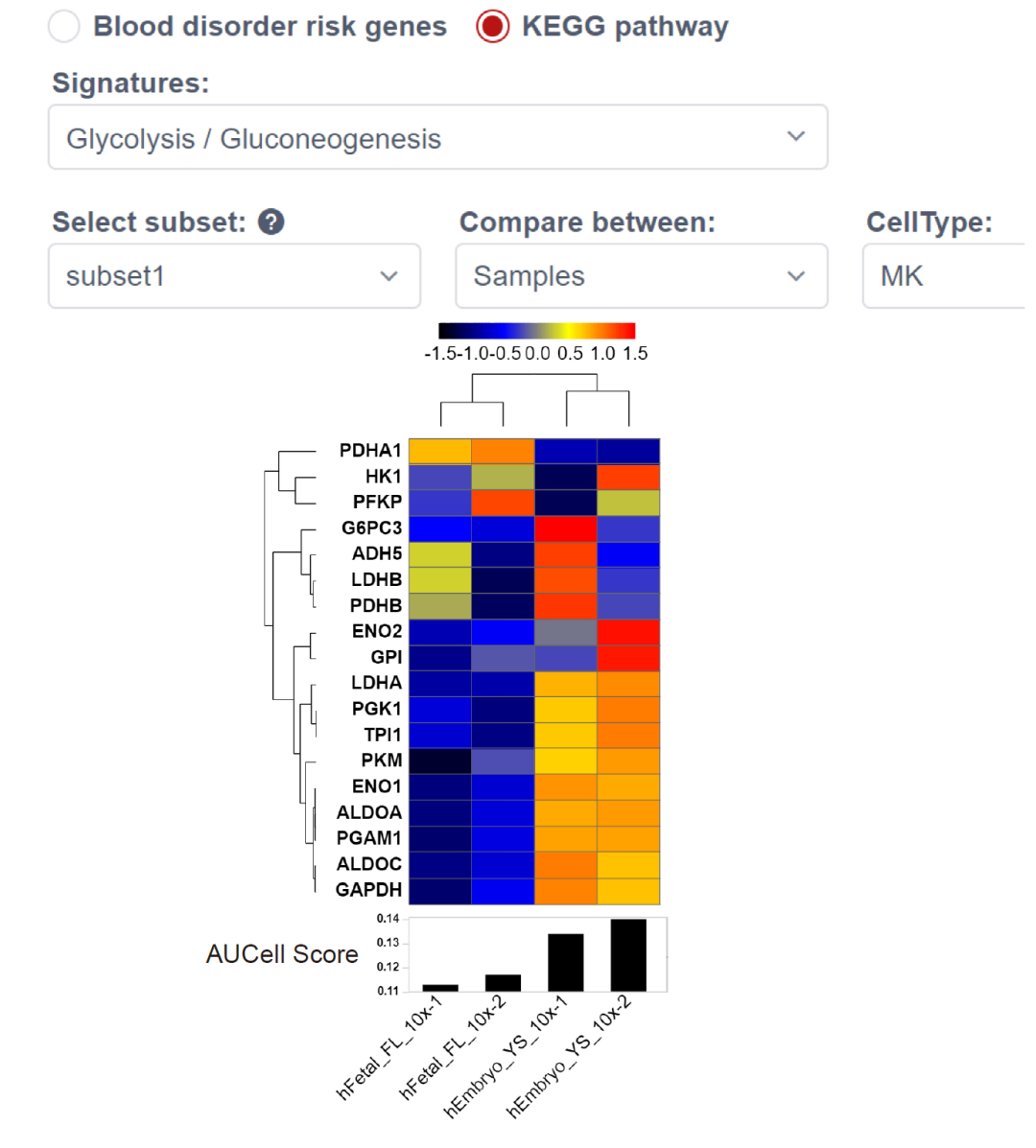 此模块显示所选特征中基因的缩放表达值。除了KEGG通路外,我们还从文献中收集了15个与血液疾病相关的基因集,以方便用户进行分析,例如“AML LSC+ 基因”特征。