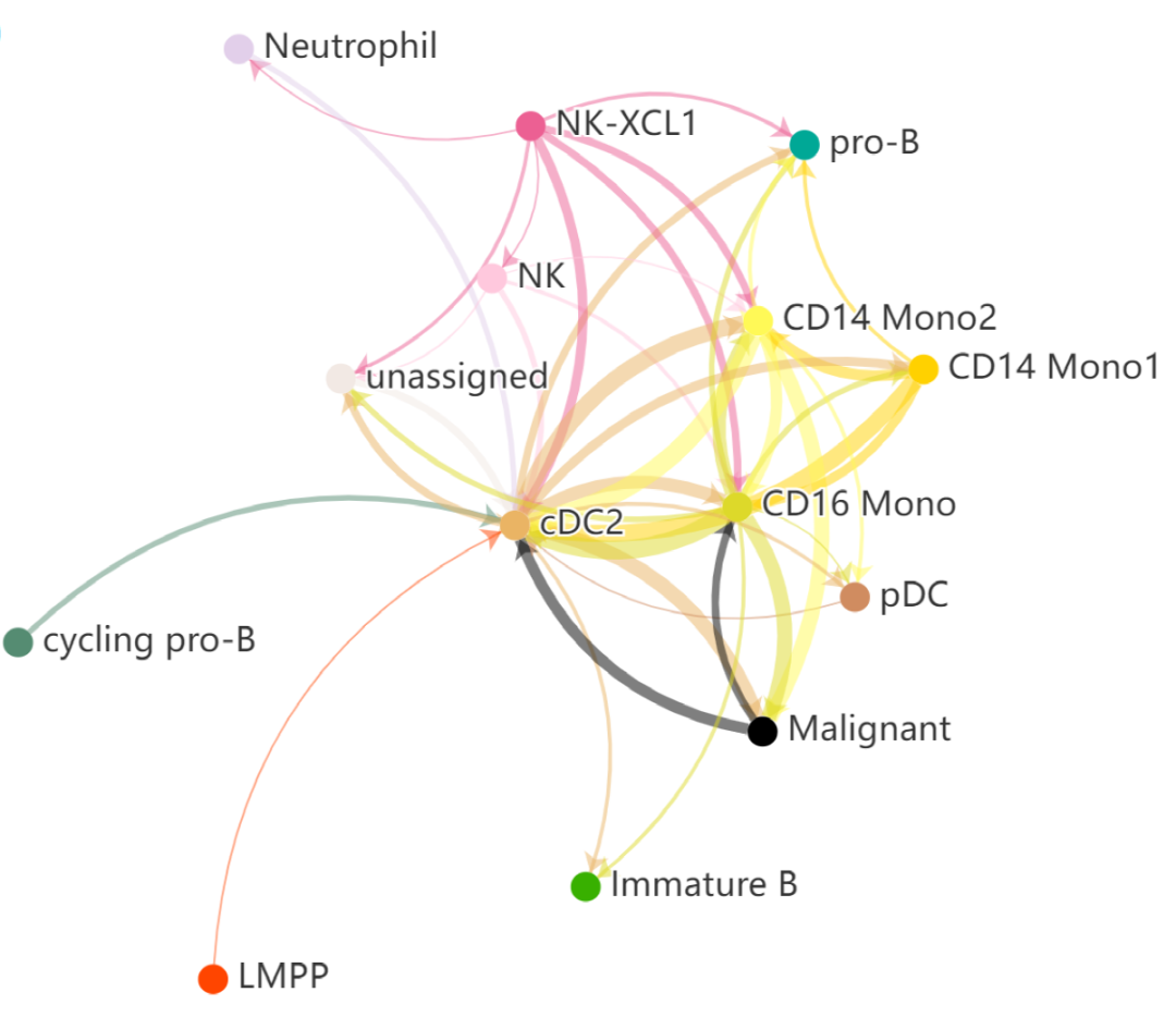 对于“LR配对强度”,用户可通过切换分析类型,探索选定细胞类型与其他细胞类型之间LR相互作用配对的强度。这些相互作用配对的方向是从配体指向受体,强度图按方向分为两类。